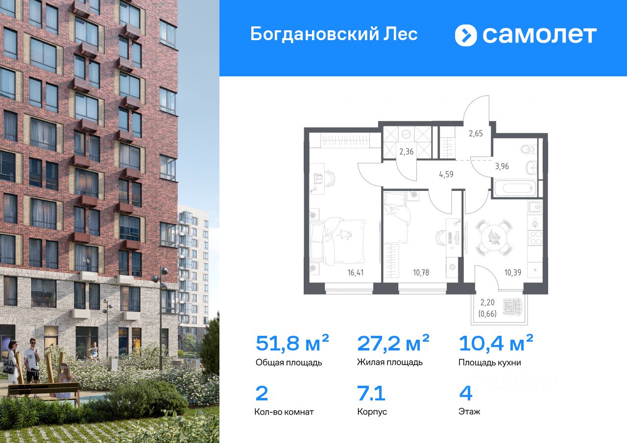 Строим кварталы для жизни с заботой о будущем. Предлагается 2-комнатная квартира комфорт-класса 51,8 кв.м в корпусе 7.1 на 4 этаже, в ЖК ''Богдановский Лес'' Квартира без отделки. Доступность опции ''отделка'' и возможность комплектации мебелью и декором уточняйте у застройщика.