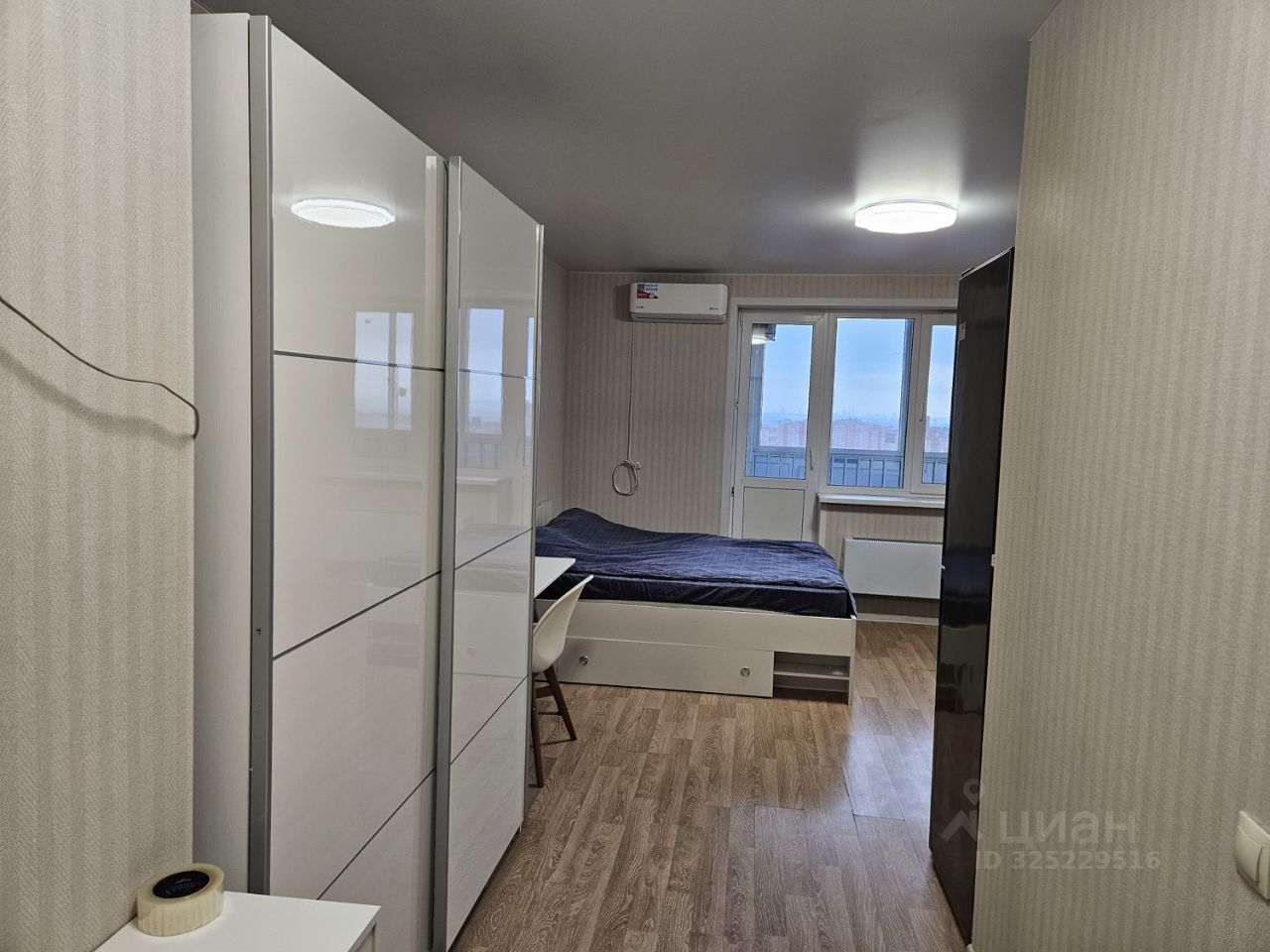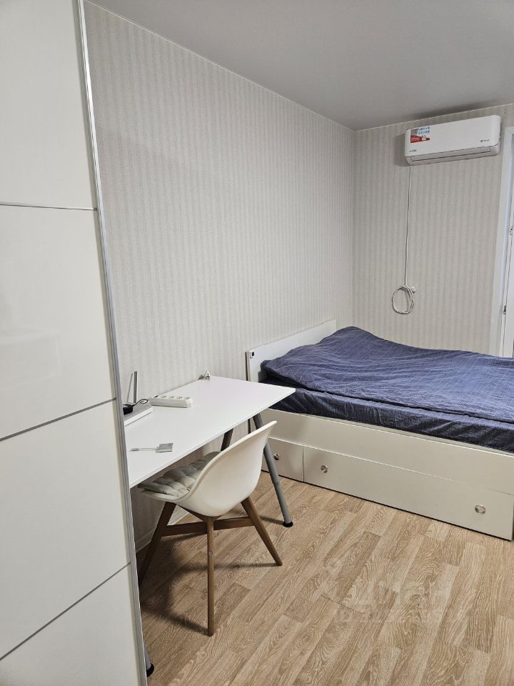 Планировка удобная и функциональная: зона сна с кроватью, место под рабочий стол, большой шкаф. Есть лоджия 2 м² — можно использовать как мини-зону отдыха или для хранения.